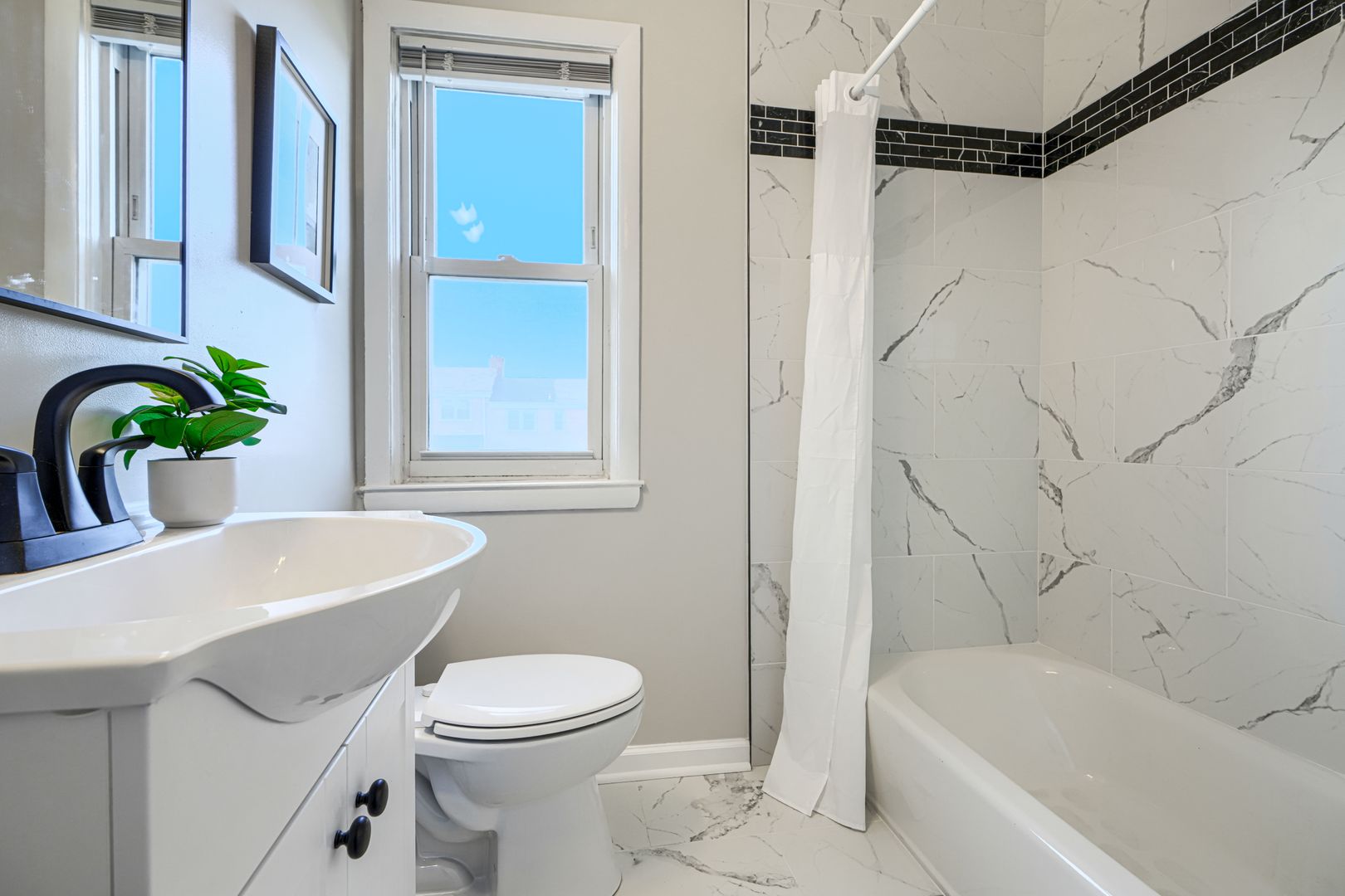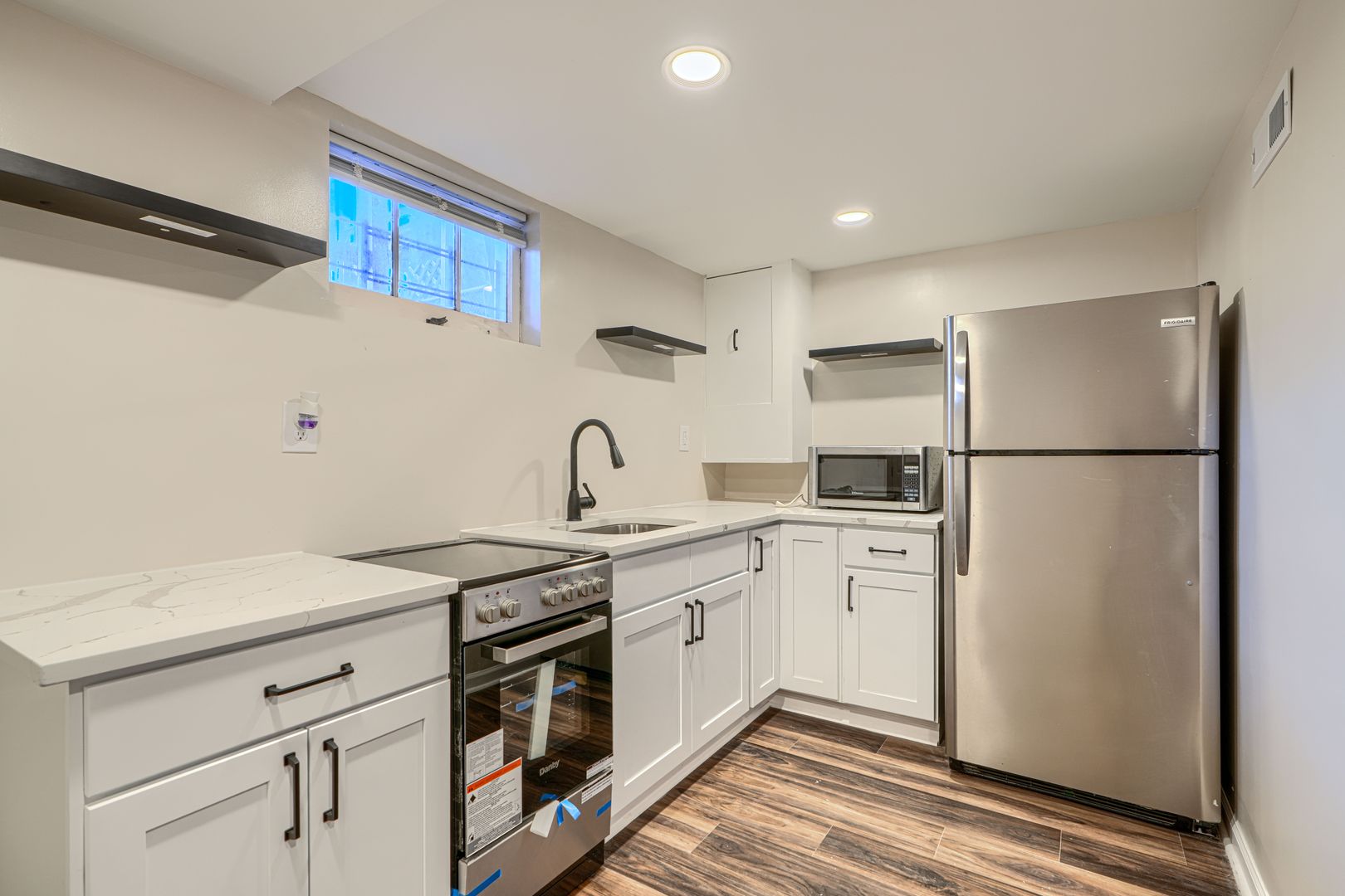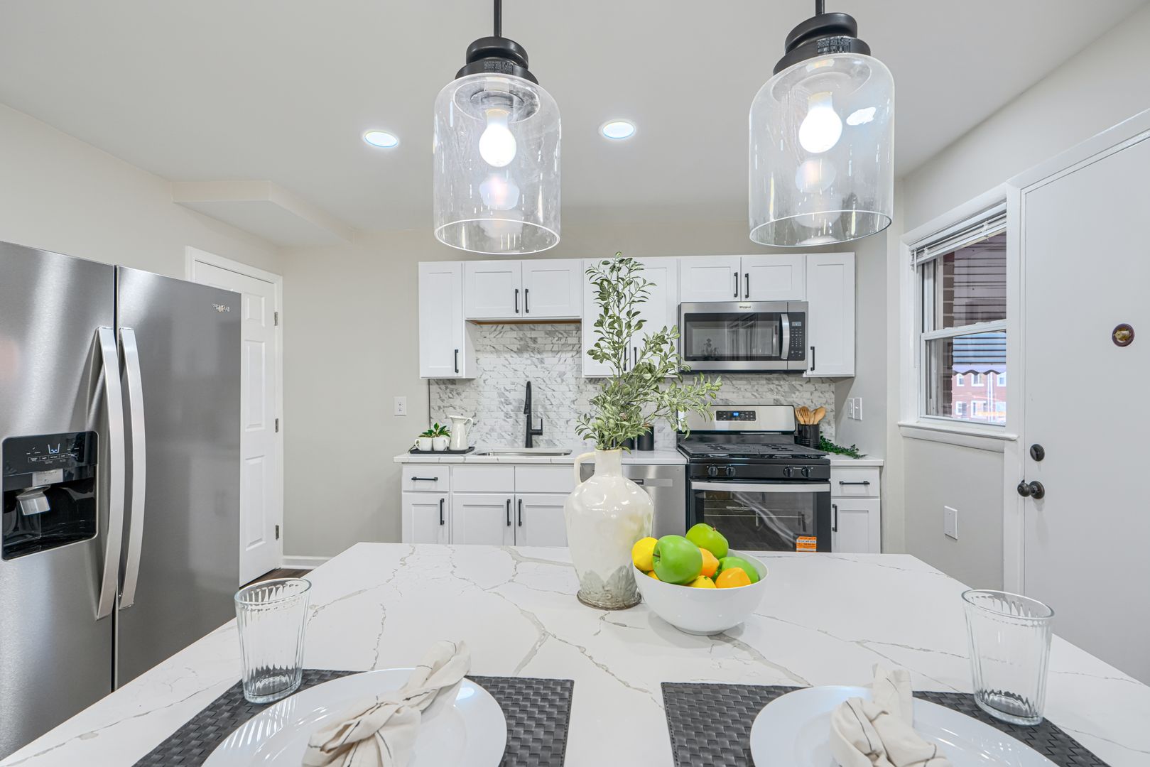 Welcome to this spacious and stunning 3 bed 2 bath rowhome with a bonus kitchen! This unit features a fully finished basement with a hangout space, a full bath, and an entire kitchen! Fully updated- granite counters, white cabinetry and brand new stainless steel appliances!! Larger kitchen located on main level with all the same finishes, more space, and an breakfast island! Lovely living area and great natural light throughout. 3 bedrooms located on 2nd level with a stunning full bath to share. Washer/Dryer, central AC, and LARGE PARKING SPACE IN REAR! Can fit up to two cars. Even has a covered rear porch! Don't miss this one. Options for low deposits, pet friendly and accepting vouchers!