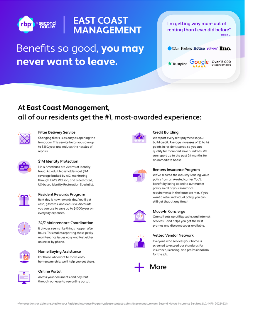 East Coast Management residents have the opportunity to be enrolled in the Resident Benefits Package (RBP) for $46.95/month which covers your REQUIRED liability renters insurance, as well as credit building to help boost the resident’s credit score with timely rent payments, up to $1M Identity Theft Protection, HVAC air filter delivery (for applicable properties), move-in concierge service making utility connection and home service setup a breeze during your move-in, our best-in-class resident rewards program, and much more! Ask us about enrolling!